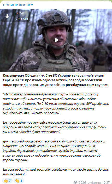 "Цель диверсионно-разведывательных групп – провести разведку наших позиций, нанести поражение военным или даже гражданским объектам. По 9-10 раз ежемесячно вражеские ДРГ пробуют заходить на территорию приграничных с россией районов Черниговской и Сумской областей. Это профессионально обученные военнослужащие сил специальных операций и главного разведывательного управления гш рф, поэтому мы должны быть всегда готовы", - заявил Наев.