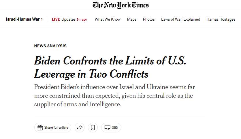 "И хотя американское вооружение и разведка играют центральную роль в обеих войнах, Байден живет с реальностью в которой военные решения должны приниматься в Израиле и Украине, а не в Соединенных Штатах. Это часто ставит Вашингтон в странное положение: он может предложить методы разрушения огромной сети туннелей в секторе Газа или прорыва через российские оборонительные линии, но дистанцируется от решений и их последствий", - пишет NYT.