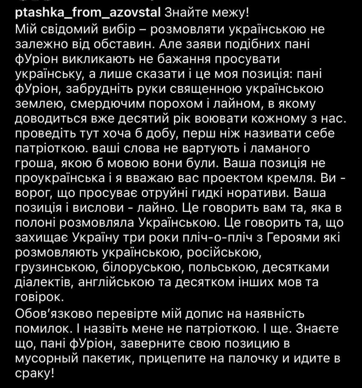 "Проведите здесь хотя бы сутки, прежде чем называть себя патриоткой. Ваши слова не стоят и ломаного гроша, на каком бы языке они не были. Ваша позиция не проукраинская, и я считаю вас проектом Кремля. Вы – враг, продвигающий ядовитые, мерзкие нарративы. Ваша позиция и высказывания – дерьмо. Это говорит вам та, которая в плену разговаривала по-украински. Это говорит вам та, которая защищает Украину три года бок о бок с героями, которые говорят на украинском, русском, грузинском, белорусском, польском, на десятке диалектов, на английском и на десятке других языков", — написала Полищук.