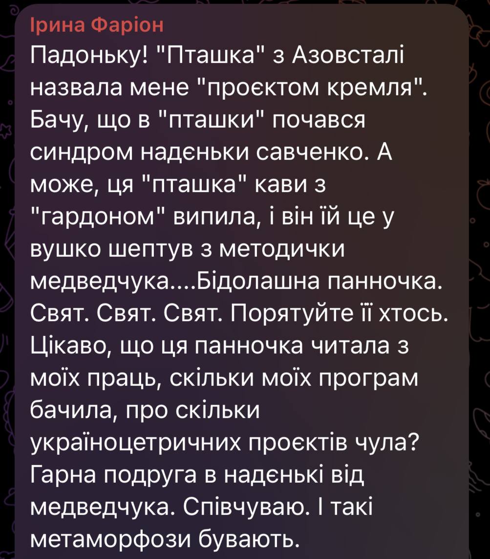 "Вижу, что у Пташки начался синдром Надежды Савченко. А может, эта Пташка кофе с "Гардоном" выпила, и он ей это в ушко шепнул из методички Медведчука... Бедная панночка. Свят, свят, свят. Спасите ее кто-нибудь", — написала Фарион.