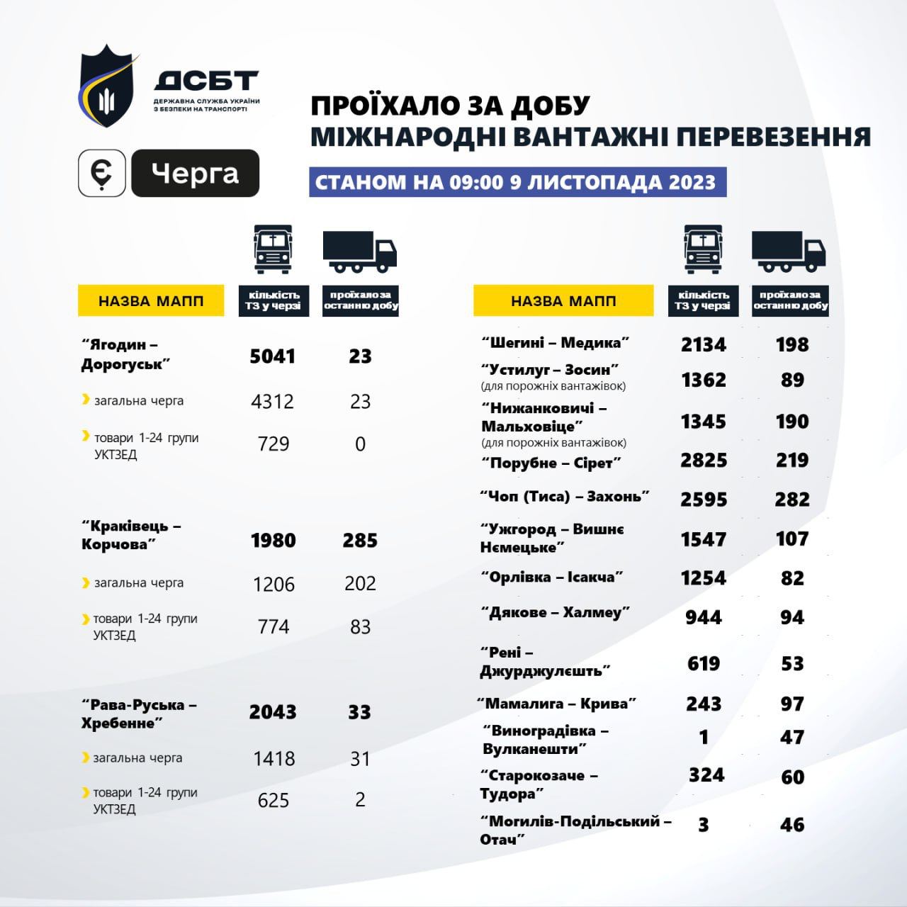 По данным "Укртрансбезопасности" на утро 9 ноября, за предыдущие сутки Ягодин - Дорохуськ проехало всего 23 грузовика (что на 10 меньше, чем 7 ноября) и почти в 20 раз меньше, чем до забастовки.
