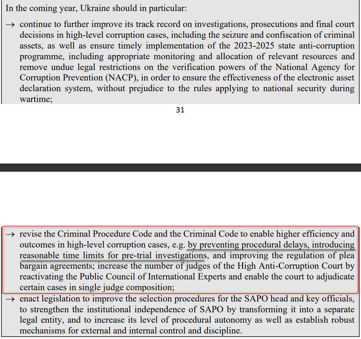 Там говорится, что Украина должна "пересмотреть Уголовный процессуальный кодекс и Уголовный кодекс с целью повышения эффективности и результативности борьбы с коррупцией на самом высоком уровне, например, путем предотвращения процессуальных задержек, введения разумных сроков досудебного расследования и совершенствования регулирования соглашений о признании вины" (на скриншоте).