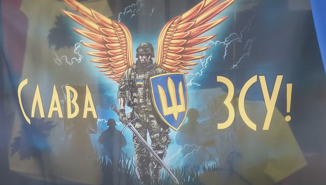 На рынке среди продуктов представлен огромный выбор украинских флагов — как ВСУ, там и добровольческих батальонов. Цена — 275 гривен.