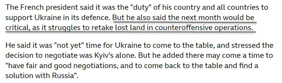"Следующий месяц будет решающим, поскольку Украина изо всех сил пытается вернуть утраченные земли в ходе контрнаступательных операций", - передает издание слова Макрона.