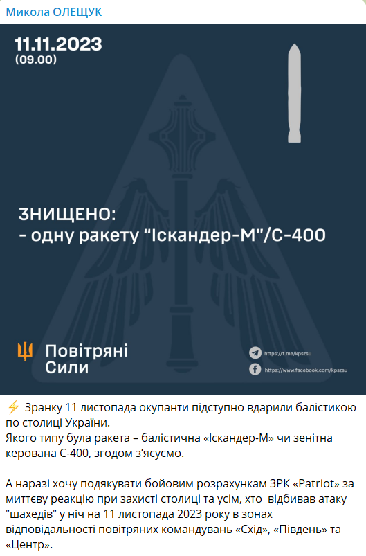 Ранее спикер Воздушных сил Юрий Игнат сообщил, что силы ПВО отразили атаку. Сигнал воздушной тревоги сработал с опозданием из-за скорости ракеты.