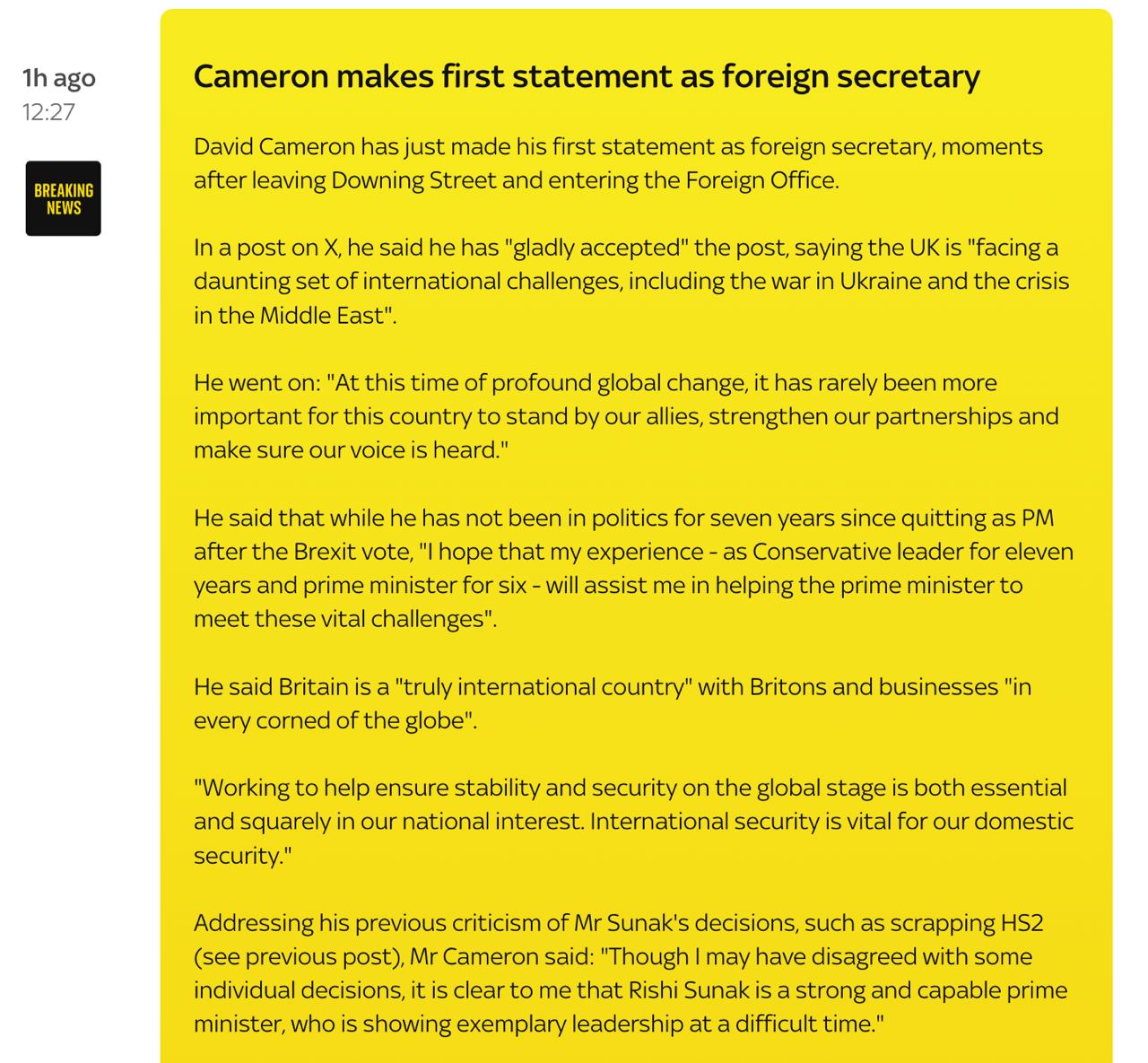 Дэвид Кэмерон сделал первое заявление в статусе министра иностранных дел Великобритании.