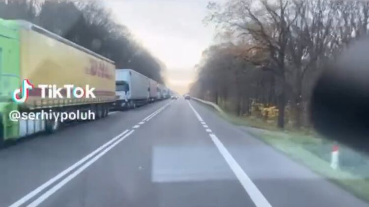 На кадрах можно увидеть вереницы грузовых автомобилей, растянувшиеся по дороге на сколько хватает глаз. В одном из роликов автор прикрепил текст, где сказано, что протяженность пробки на польской границе составляет 30 километров.