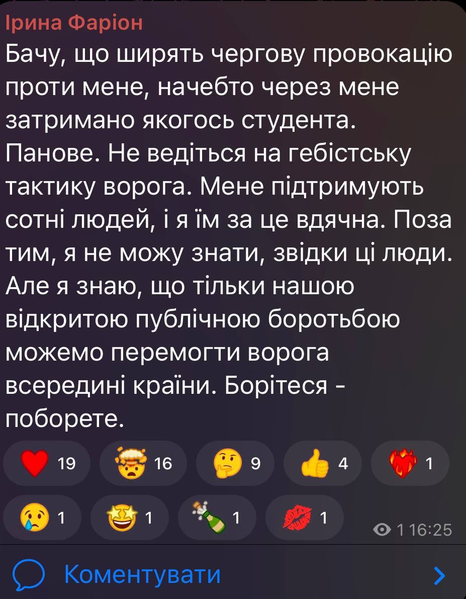 "Вижу, что распространяют очередную провокацию против меня, будто из-за меня задержан какой-то студент. Господа. Не ведитесь на гэбистскую тактику врага. Меня поддерживают сотни людей, и я им за это благодарна. Помимо того, я не могу знать, откуда эти люди. Но я знаю, что только нашей открытой публичной борьбой мы можем победить врага внутри страны", - написала Фарион в своем телеграм-канале.