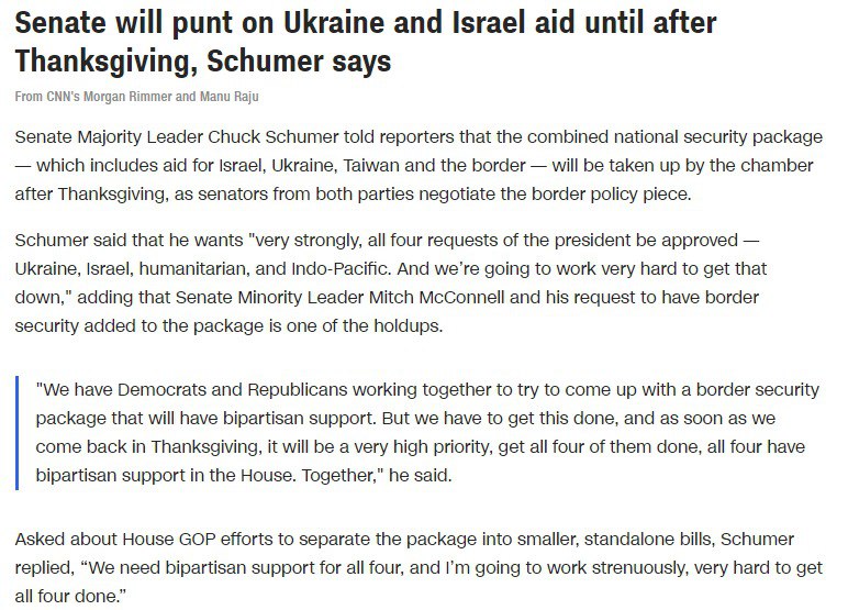 Комбинированный пакет национальной безопасности, включающий помощь Израилю, Украине, Тайваню и укрепление американской границы, будет рассматриваться Палатой представителей США после Дня благодарения (то есть после 23 ноября).