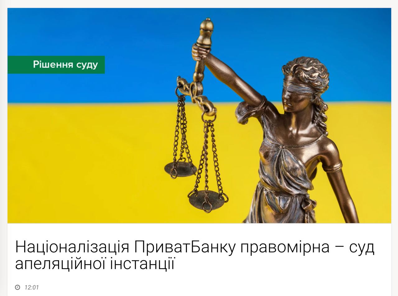 Суд признал законной национализацию Приватбанка в 2016 году и закрыл дело. Шестой апелляционный административный суд отменил решение Окружного административного суда Киева от 2019 года, который по иску Игоря Коломойского признал противоправными действия госорганов по национализации и отменил их.