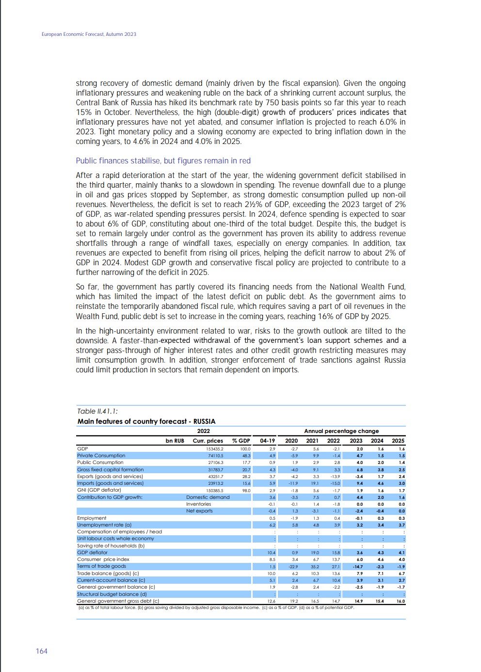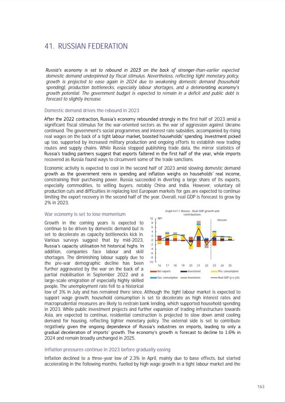 "России удалось перенаправить большую часть своего экспорта, особенно сырьевые товары, в Китай, Индию и другие страны. Однако добровольное сокращение добычи нефти и трудности с заменой утраченных европейских рынков газа будут ограничивать восстановление экспорта во второй половине года. В целом реальный ВВП страны, по прогнозам, вырастет на 2% в 2023 году", — говорится в документе.