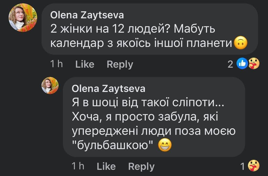 Комментарии Елены Зайцевой, намекающие на гендерную дискриминацию в календаре, активно обсуждают в украинском сегменте Фейсбука.