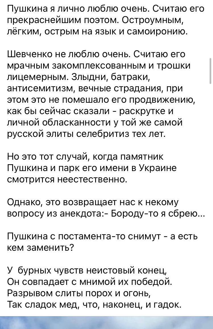"В принципе, можно запретить книжки и разрушить памятники всем украинским писателям, которые жили при Российской империи. Это тоже путь. Но точно не к победе... Маленькая тоталитарная страна не победит большую", - написал Константин Кошелев.