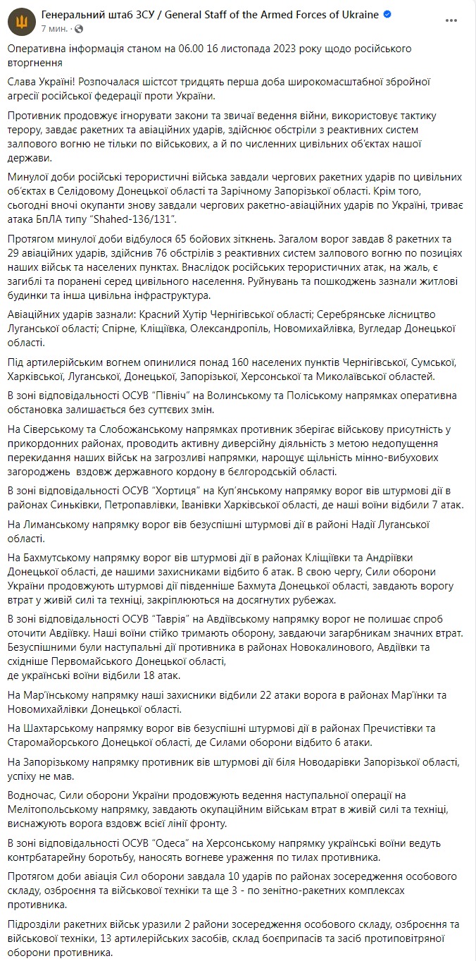 6.50 О 7 ударах россиян в ночь на 16 ноября по населенному пункту Чугуевского района Харьковской области сообщает глава Харьковской ОВА Синегубов.
