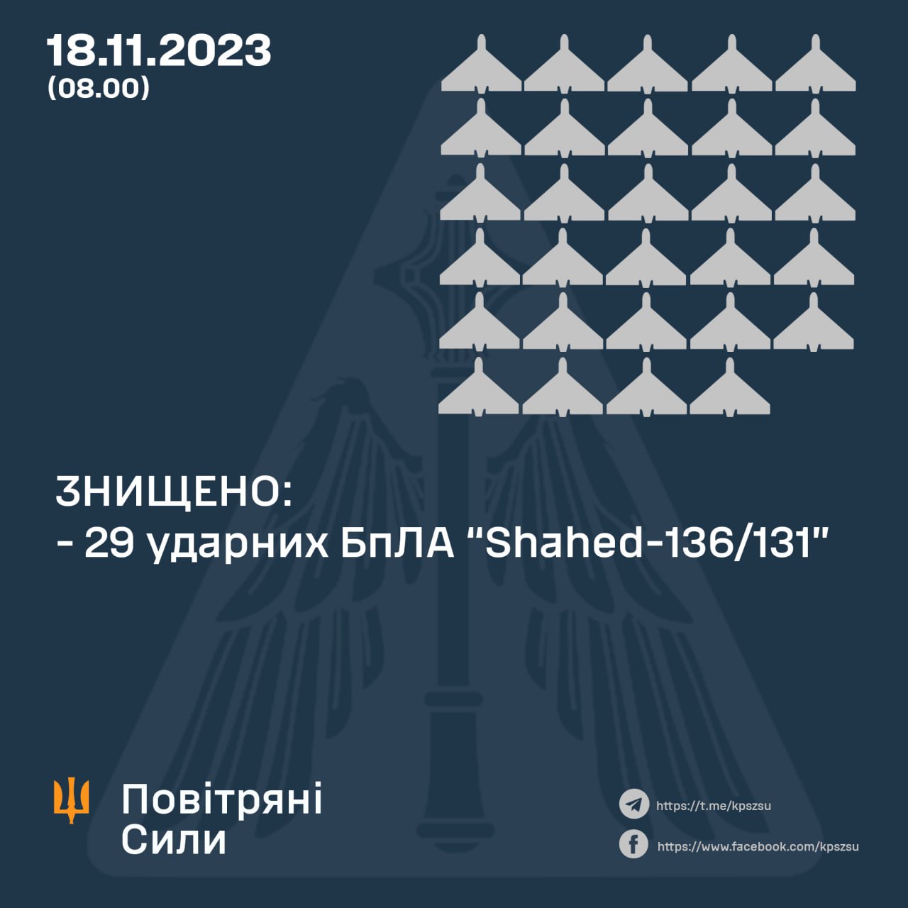 "В результате противовоздушного боя уничтожены 29 ударных БпЛА", - написали в Воздушных силах.