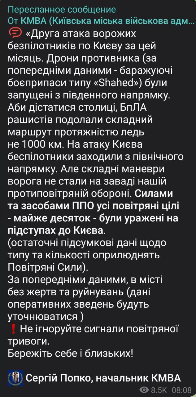 "Вторая атака вражеских беспилотников по Киеву за этот месяц. Дроны противника были запущены с южного направления. Чтобы добраться до столицы, БпЛА рашистов преодолели сложный маршрут протяженностью чуть ли не 1000 км. В атаку Киева беспилотники заходили с северного направления. Но сложные маневры врага не помешали нашей противовоздушной обороне" - сообщил глава КГВА Сергей Попко.