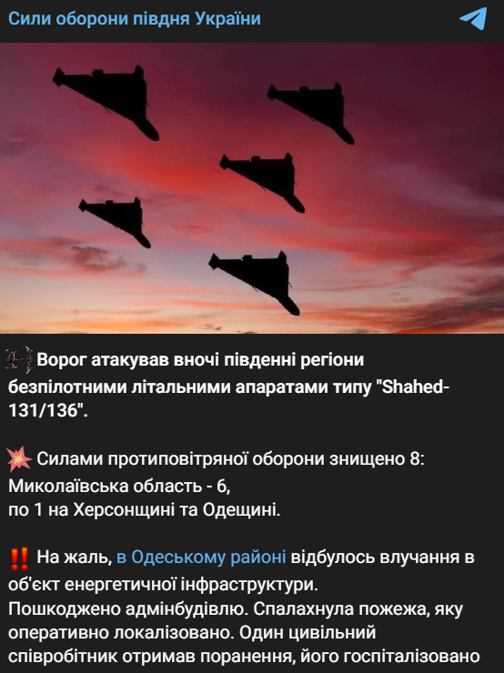 Сегодня ночью россияне атаковали южные регионы беспилотными летательными аппаратами типа "Shahed-131/136". В Одесском районе "Шахед" ударил по объекту энергетики. Загорелось админздание, есть пострадавший.