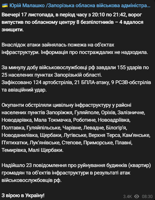 "Вечером 17 ноября, в период времени с 20:10 до 21:42, враг выпустил по областному центру 8 беспилотников – 4 удалось уничтожить", - написал он.