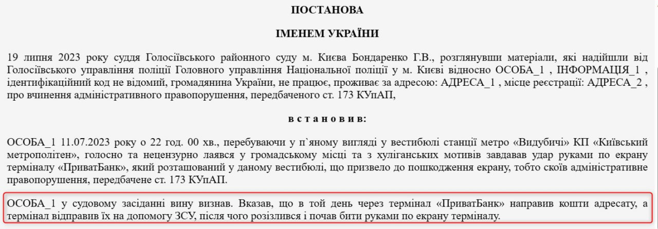 Как говорится в решении Голосеевского суда, он был задержан, когда начал бить руками и ногами по терминалу на станции метро "Выдубичи".