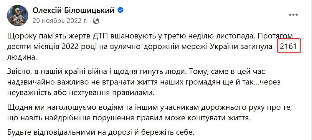 "За 10 месяцев 2023 года в Украине зарегистрировано 19 743 ДТП с погибшими и/или травмированными, в результате которых погибли 2 492 человека и травмированы 24 774", - написал Белошицкий.