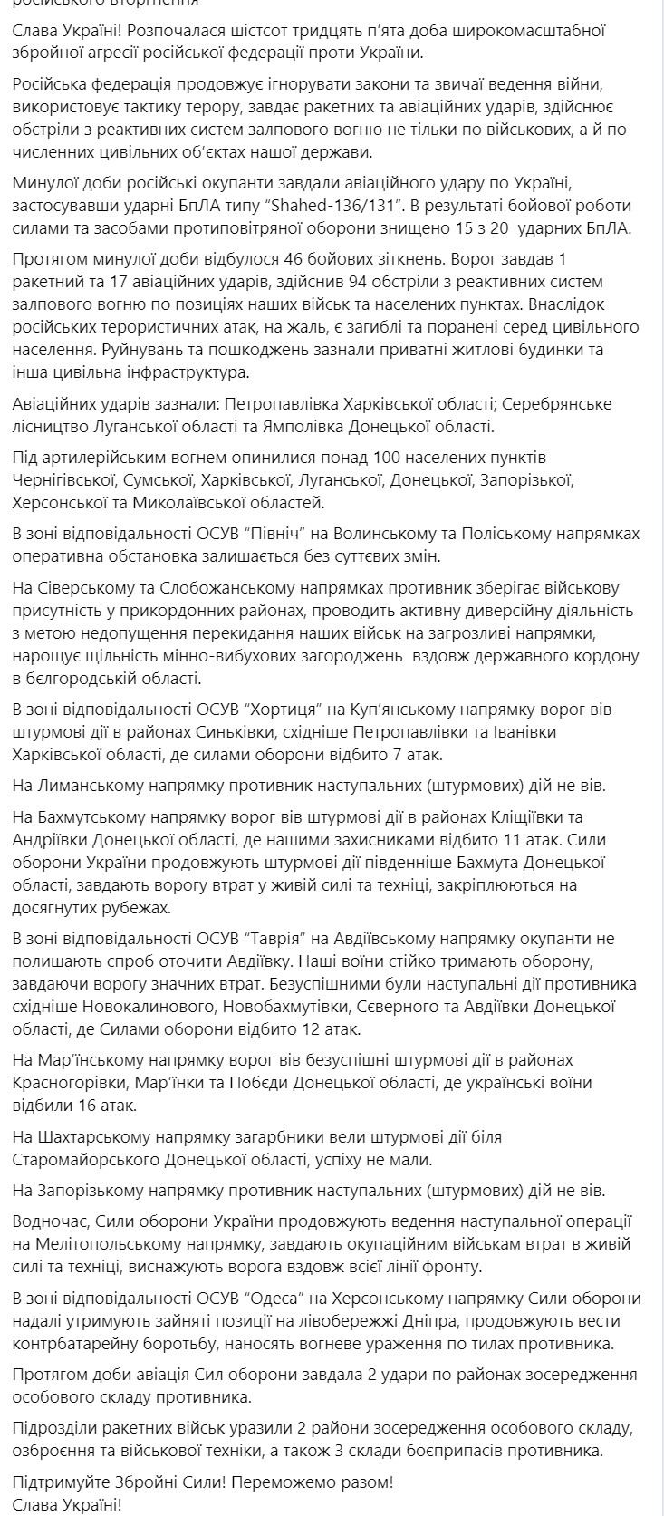 За прошедшие сутки произошло 46 боевых столкновений. Россияне нанесли 1 ракетный и 17 авиационных ударов, совершили 94 обстрела из реактивных систем залпового огня по позициям наших войск и населенным пунктам.