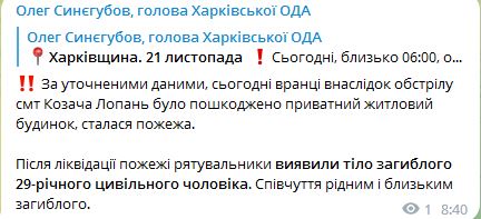 Во вторник, 21 ноября, около 6 утра РФ ударила по поселку Казачья Лопань в Харьковской области.