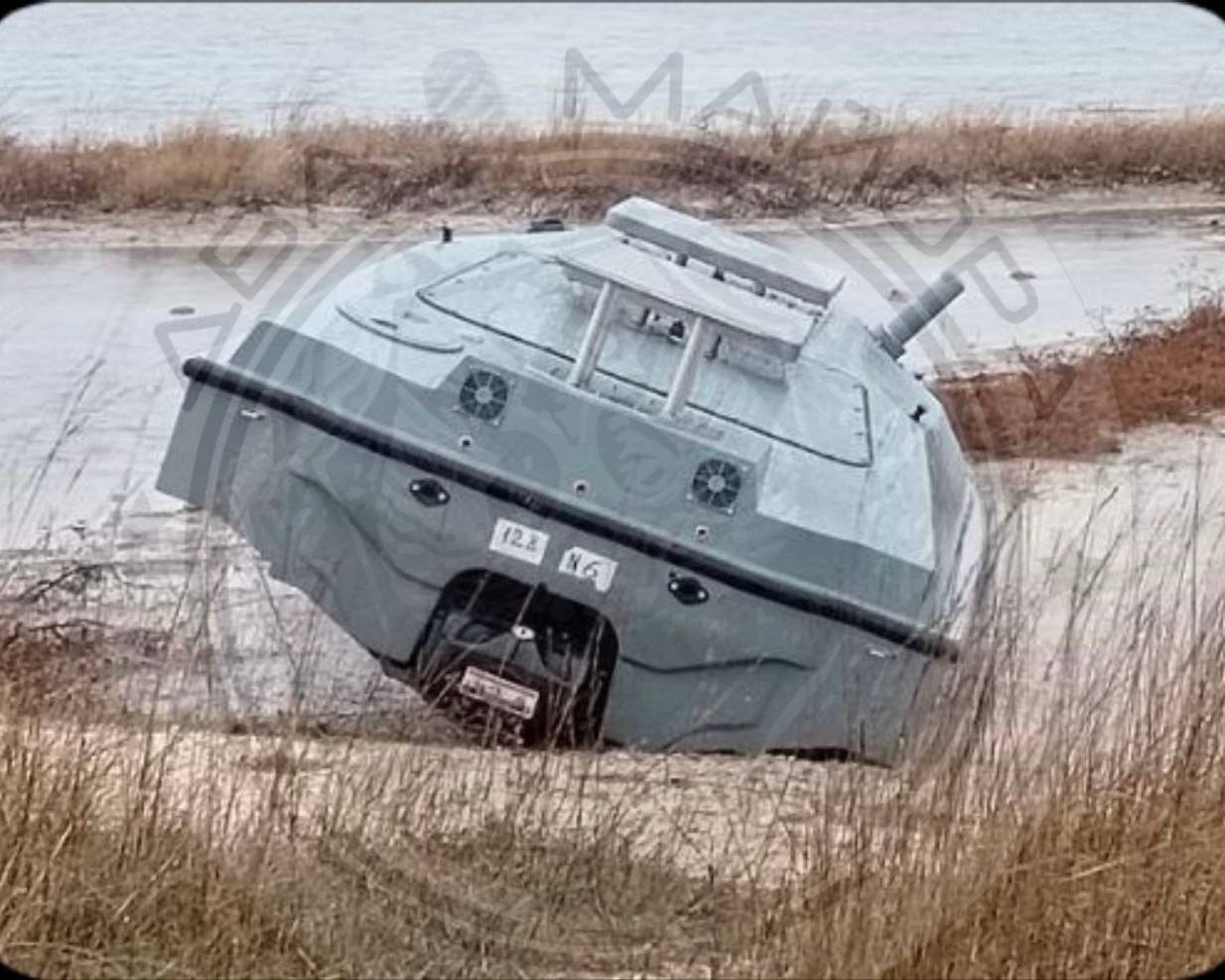 Российские военные телеграм-каналы публикуют фото, как утверждается, украинского надводного дрона Magura V5, который сегодня выбросило на берег в районе Донузлава в оккупированном Крыму.