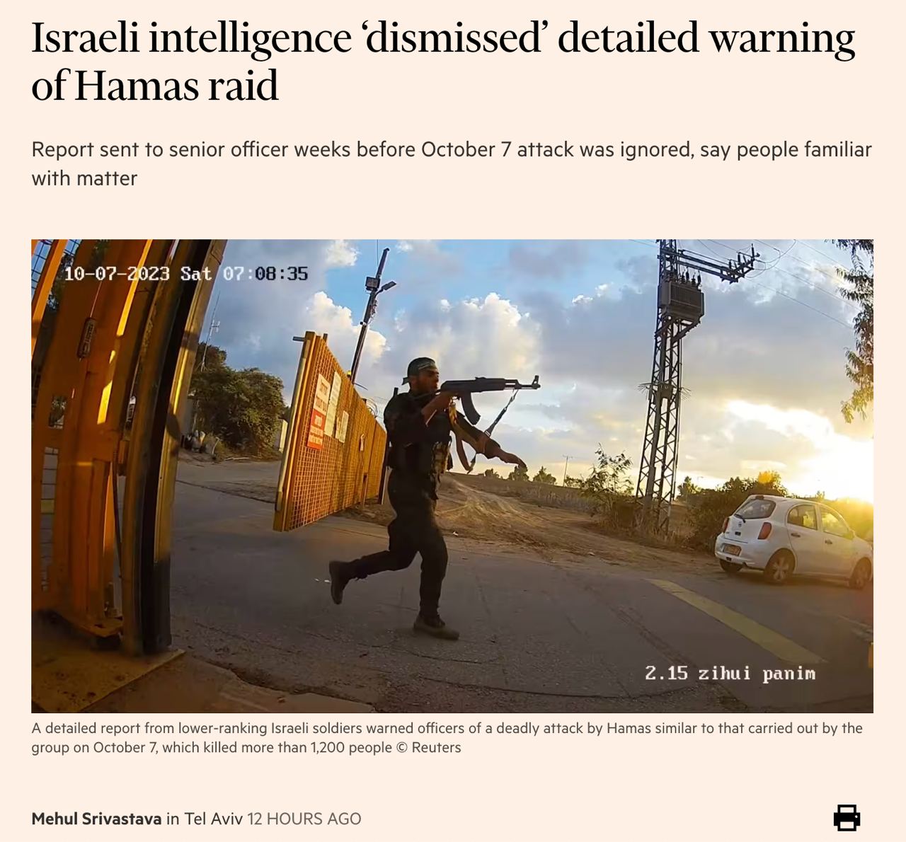 По словам источников, командование проигнорировало сигнал не только потому, что он исходил от солдат более низкого ранга, но и потому, что противоречил уверенности израильского правительства в том, что оно сдержит ХАМАС посредством карательной блокады, бомбардировок его военных объектов и умиротворения деньгами и помощью.