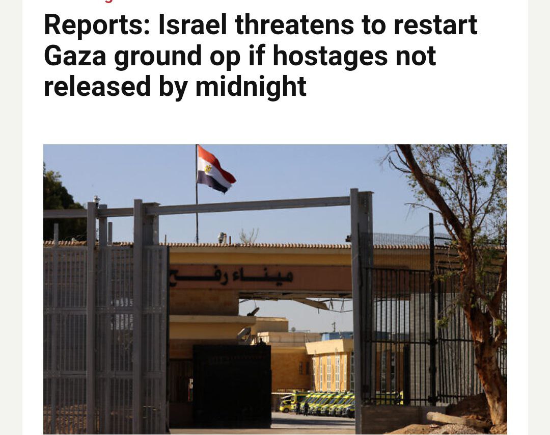 Но после того, как ХАМАС отказался освободить оговоренное количество заложников, Израиль угрожает возобновить боевые действия в анклаве. Обвинения в нарушении договорённостей Израиль опровергает и требует освободить заложников до полуночи.