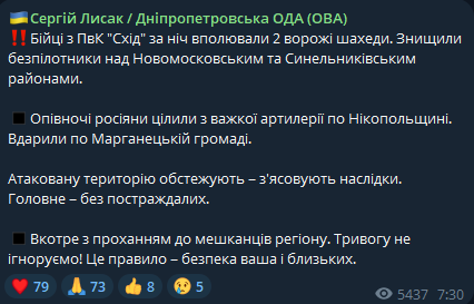 Также было сообщено, что два беспилотника были сбиты ночью над Днепропетровской областью и "приземлились" над Новомосковским и Синельниковским районами.