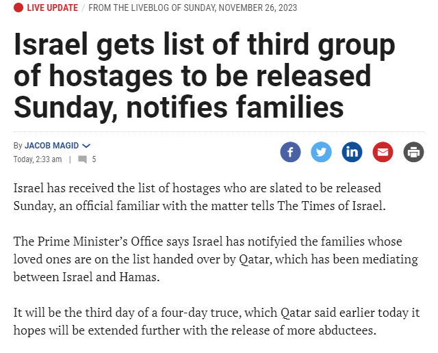 В воскресенье, 26 ноября, ХАМАС освободит еще несколько израильских заложников.