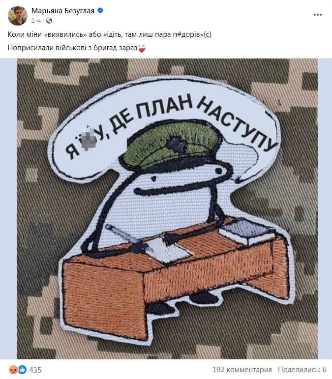 Она разместила в Фейсбуке карикатуру на военного, который в матерной форме сообщает, что не знает, есть ли "план наступления". Картинку она сопроводила следующей подписью: "Когда мины "обнаружились" или "идите, там только пара п#доров"(с). Прислали военные из бригад сейчас".