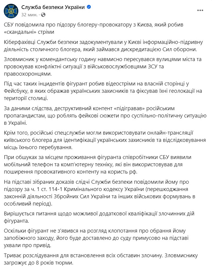"Злоумышленник в комендантский час намеренно передвигался по улицам города и провоцировал конфликтные ситуации с военнослужащими ВСУ и правоохранителями. Во время таких инцидентов фигурант делал видеострим на собственной странице в Фейсбуке, в котором оскорблял украинских защитников и фиксировал геолокации на территории столицы. По данным следствия, деструктивный контент "подыгрывал" российским пропагандистам, делающим фейковые сюжеты об общественно-политической ситуации в Украине", - пишет СБУ.