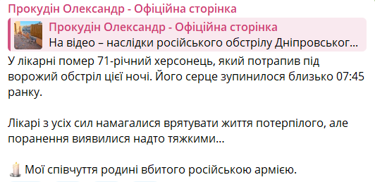 "В больнице скончался 71-летний херсонец, попавший под вражеский обстрел этой ночью. Его сердце остановилось около 07:45 утра", - позже написал Прокудин.