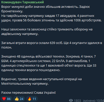 Между тем командующий направлением Александр Тарнавский сообщил, что армия РФ за минувшие сутки значительно "увеличила активность" на таврическом направлении, но ВСУ "стойко удерживают оборону" под Авдеевкой.