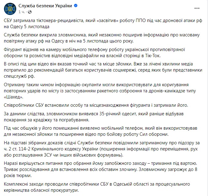 По данным СБУ, мужчина снял на камеру мобильного телефона работу украинской противовоздушной обороны и опубликовал видео на своей странице в ТикТок. В описании под этим видео он указал точное время и место съемки.