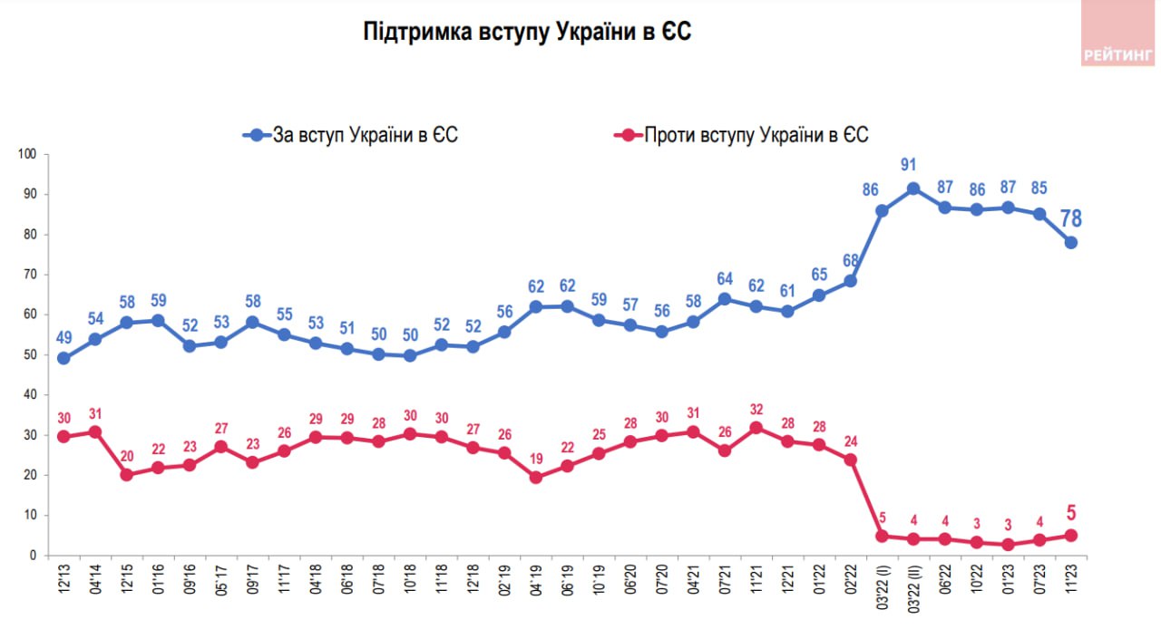 Количество сторонников вступления Украины в ЕС уменьшилось с июля на 7%, вступления в НАТО – уменьшилось на 6%.