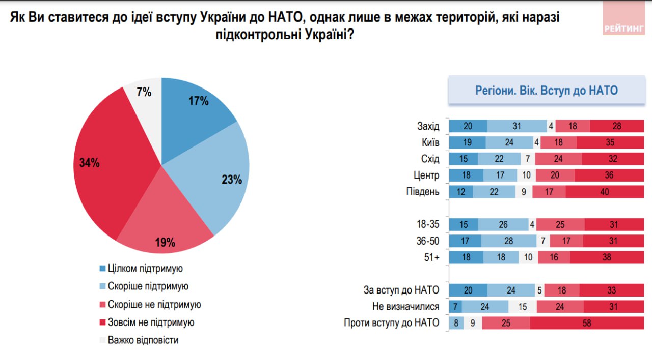 Также украинцев спросили, согласились бы они на вступление в НАТО в границах тех территорий Украины, которые сейчас находятся под ее контролем (такую идею, в частности, продвигает экс-советник Офиса президента Алексей Арестович). Здесь мнения разделились в куда менее однозначной пропорции.
