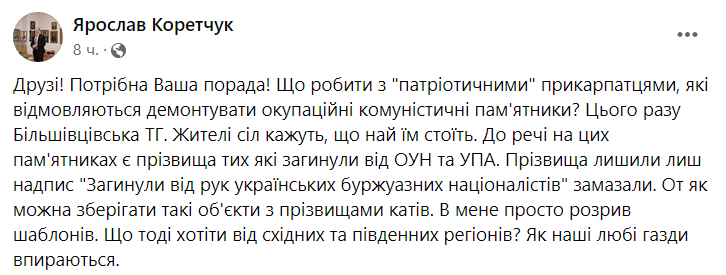 "Жители сел говорят, что пусть стоят. Кстати, на этих памятниках есть фамилии тех, кто погиб от ОУН и УПА. Фамилии оставили, только надпись "Погибли от рук украинских буржуазных националистов" замазали", - сообщил Коретчук.