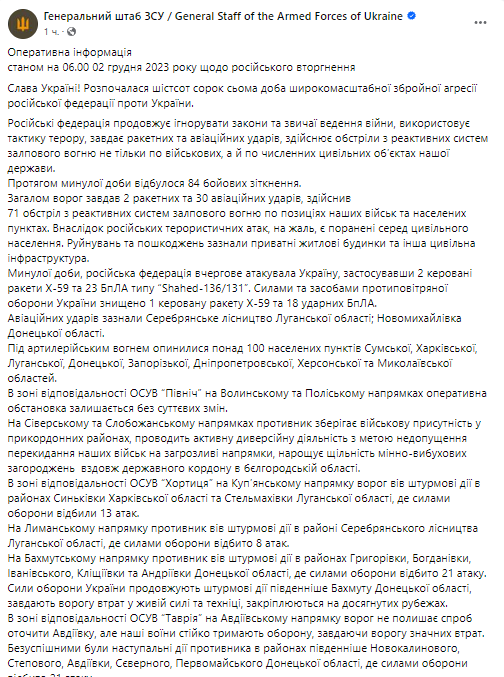 В пятницу, 2 декабря, Генштаб ВСУ обнародовал сводку о ситуации на фронте на утро.