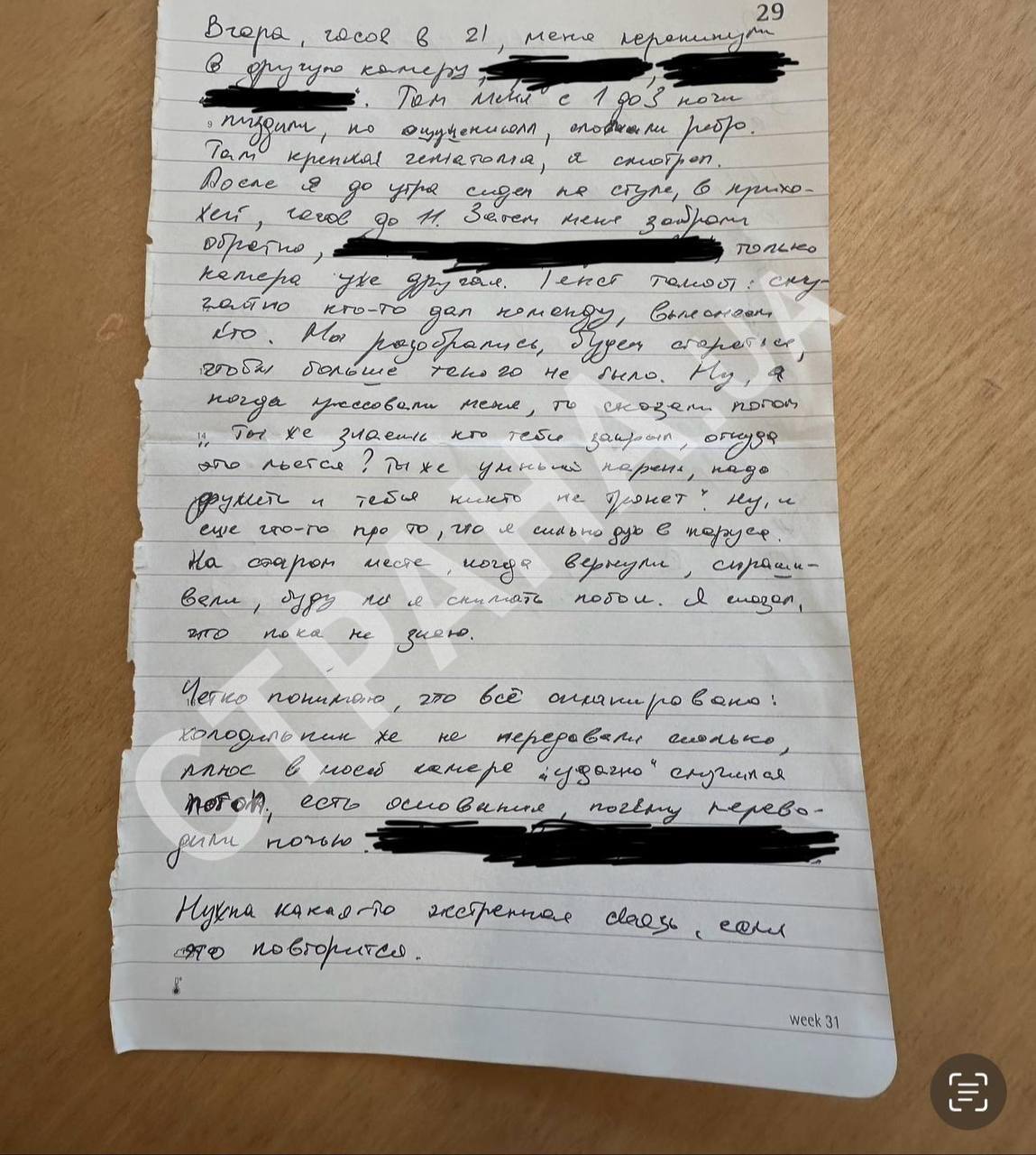 "Вчера, часов в 21, меня перекинули в другую камеру. Там меня с часу до 3 ночи п@здили, по ощущениям, сломали ребро. Там крепкая гематома, я смотрел. После я до утра сидел на стуле, в прихожей, часов до 11. Затем меня забрали обратно, только камера уже другая", - говорится в записке.