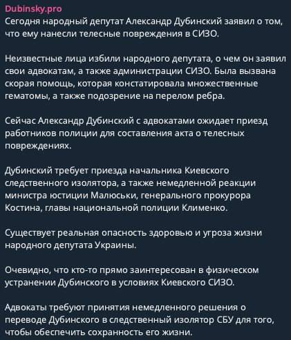 "Неизвестные лица избили народного депутата, о чем он заявил своим адвокатам, а также администрации СИЗО. Была вызвана скорая помощь, которая констатировала множественные гематомы, а также подозрение на перелом ребра. Сейчас Александр Дубинский с адвокатами ожидает приезд работников полиции для составления акта о телесных повреждениях", - написано в телеграмм-канале нардепа, который сейчас ведут его адвокаты.