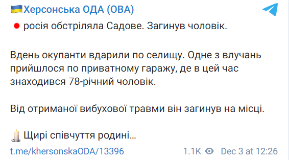 13:20 Сегодня днем в селе Садовое Херсонской области в результате очередных российских обстрелов погиб мужчина 78 лет.