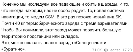 По его словам, в одном из сбитых БПЛА обнаружили почти 40 кг термобарического заряда с тремя взрывателями.