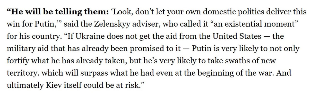 По его словам, если Украина не получит помощи от Соединенных Штатов, "Путин, вероятно, не только закрепится там, что он уже взял, но, скорее всего, захватит новые территории... И в конечном итоге сам Киев может оказаться под угрозой", - заявил представитель Банковой.