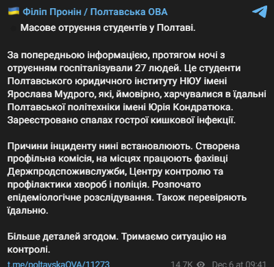 Вероятно, они питались в столовой Полтавской политехники имени Юрия Кондратюка. Начато эпидемиологическое расследование.