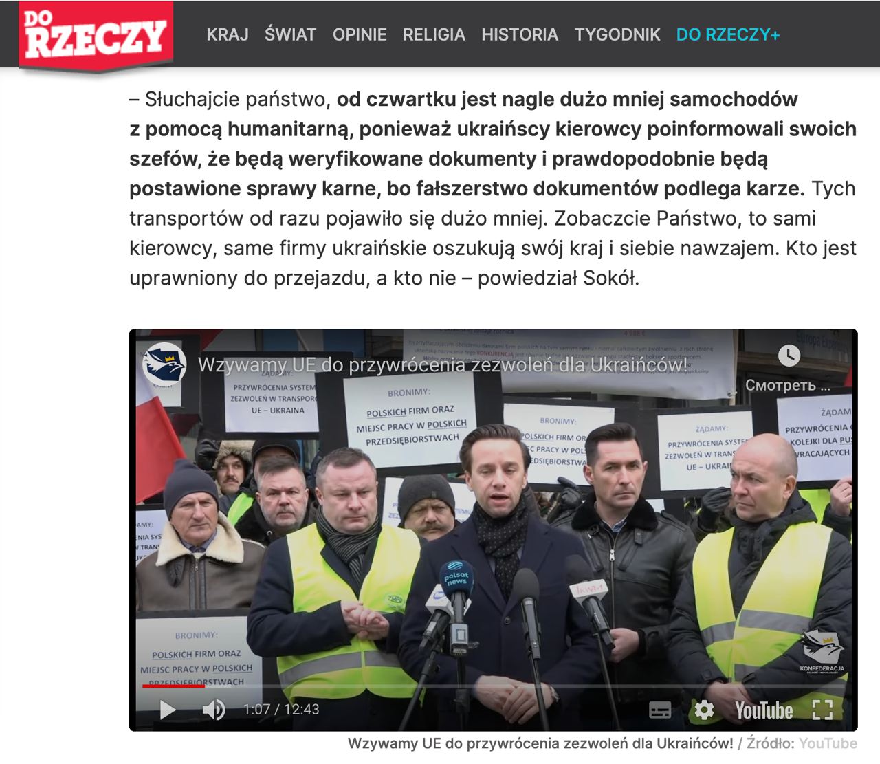 "Слушайте, дамы и господа, с четверга машин с гуманитарной помощью вдруг стало гораздо меньше, потому что украинские водители сообщили своему начальству, что документы будут проверены и, возможно, будут возбуждены уголовные дела, потому что подделка документов наказуема. Этих транспортов появилось сразу гораздо меньше. Видите ли, это сами водители, сами украинские компании обманывают свою страну и друг друга. Кто имеет право путешествовать, а кто нет", - заявил Яцек Сокол.