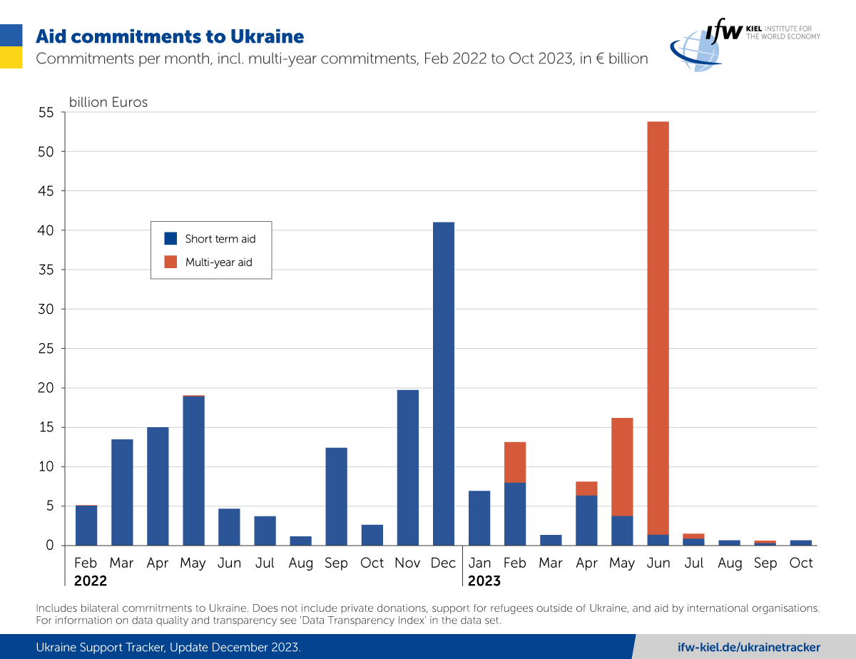 Помощь Украине в августе-октябре 2023 года упала почти на 90% по сравнению с аналогичным периодом прошлого года. Ее объем составил 2,11 млрд евро. Это самый низкий уровень с января 2022 года.