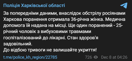 В результате обстрела россиянами Харькова ранения получила 36-летняя женщина. Медицинская помощь ей оказана на месте. Еще один раненый - 25-летний мужчина со взрывными травмами госпитализирован в больницу. Состояние здоровья удовлетворительное.