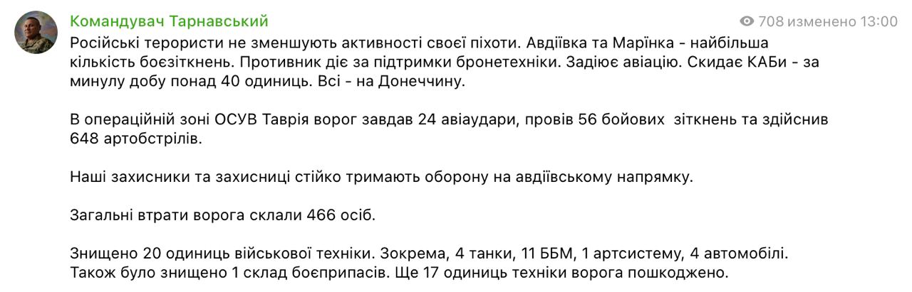 13:08 Армия РФ за минувшие сутки сбросила более 40 авиабомб в Донецкой области, сообщает командующий Александр Тарнавский.